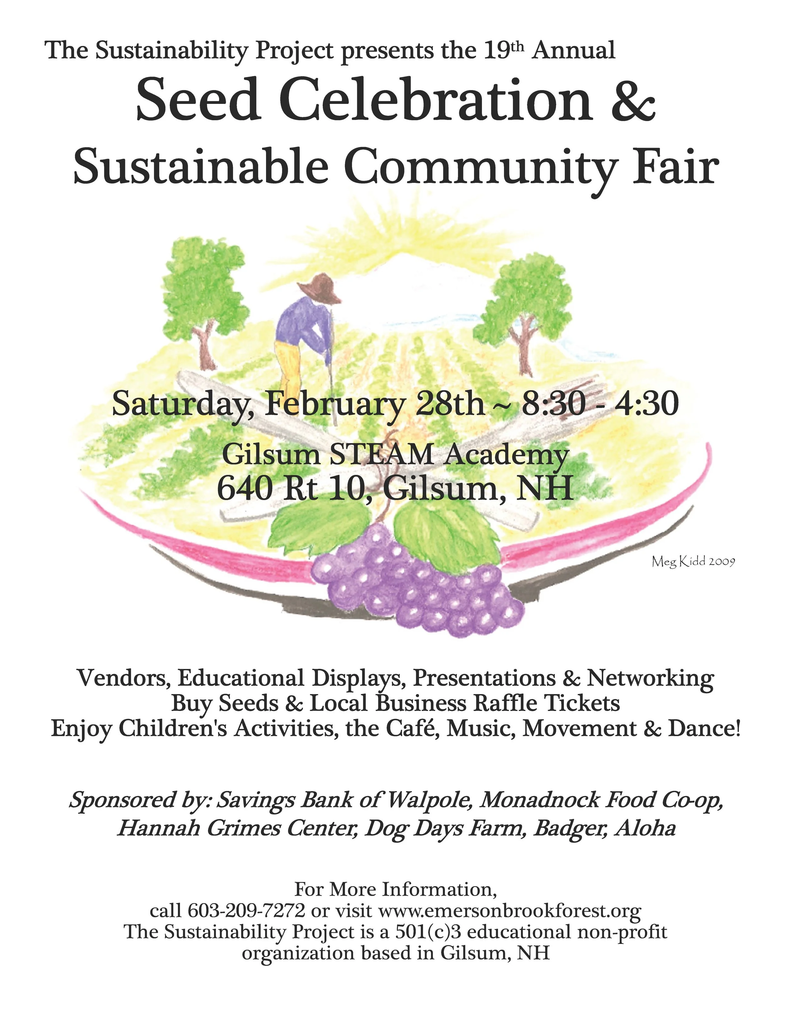 The Seed Celebration and Sustainable Community Fair is sponsored by The Savings Bank of Walpole, Hannah Grimes Center for Entrepreneurship, Aloha of Keene Yoga Studio, Dog Days Farm, The Monadnock Food Co-op and W.S.Badger Company.