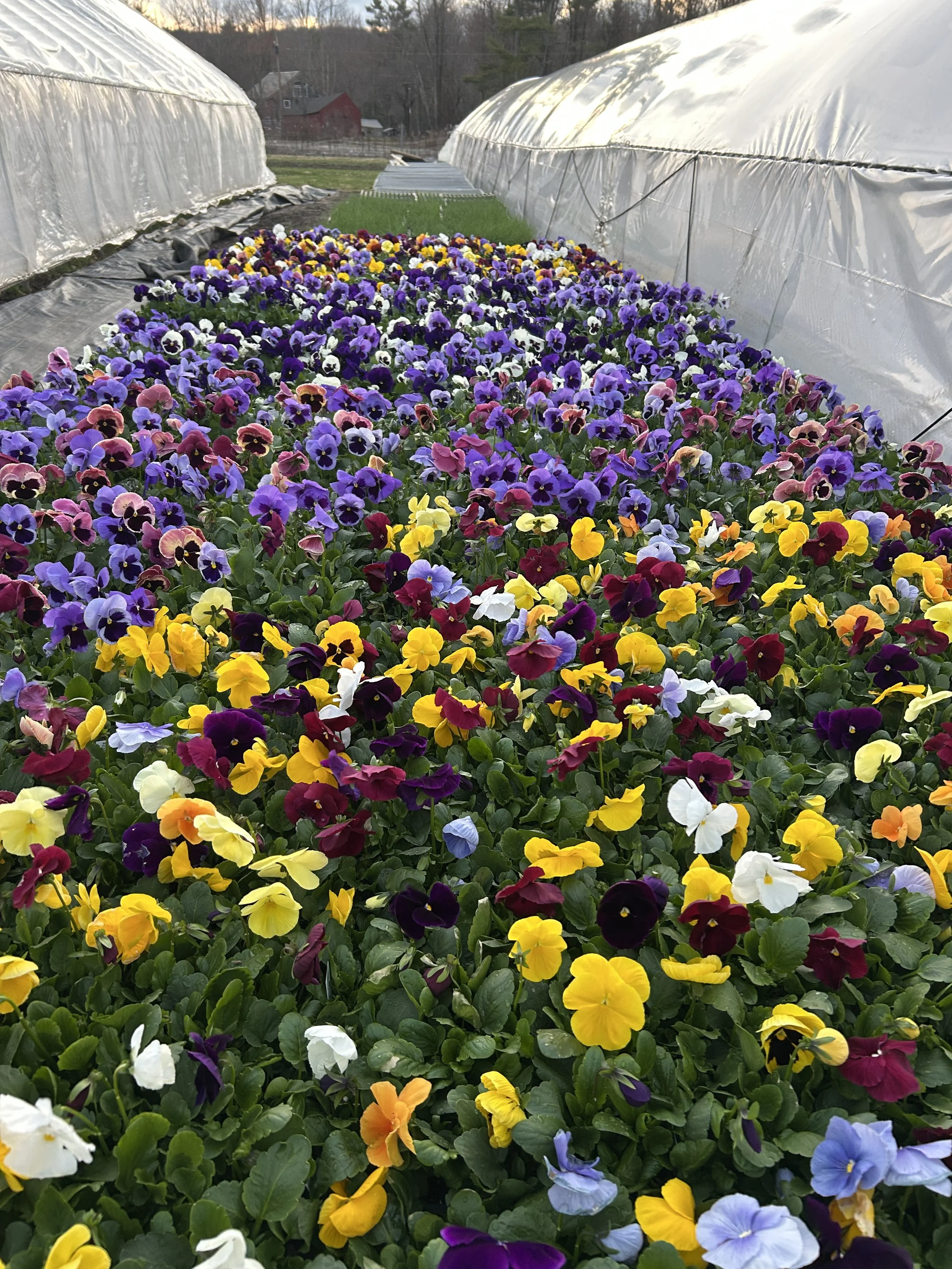 Evening, Folks! We’ve had a beautiful stretch of days and I’m gonna keep this short cause we’ve been taking advantage of em and I’ve got the sunburn to prove it! We’ll be at our Cheshire Med market tomorrow with lots of our own spring greens, beautiful pansies, and storage veggies from local organic farms. There are a few new things at the market, too, including spicy salad mix and arugula! The farm store is stocked with greens and pansies, as well.